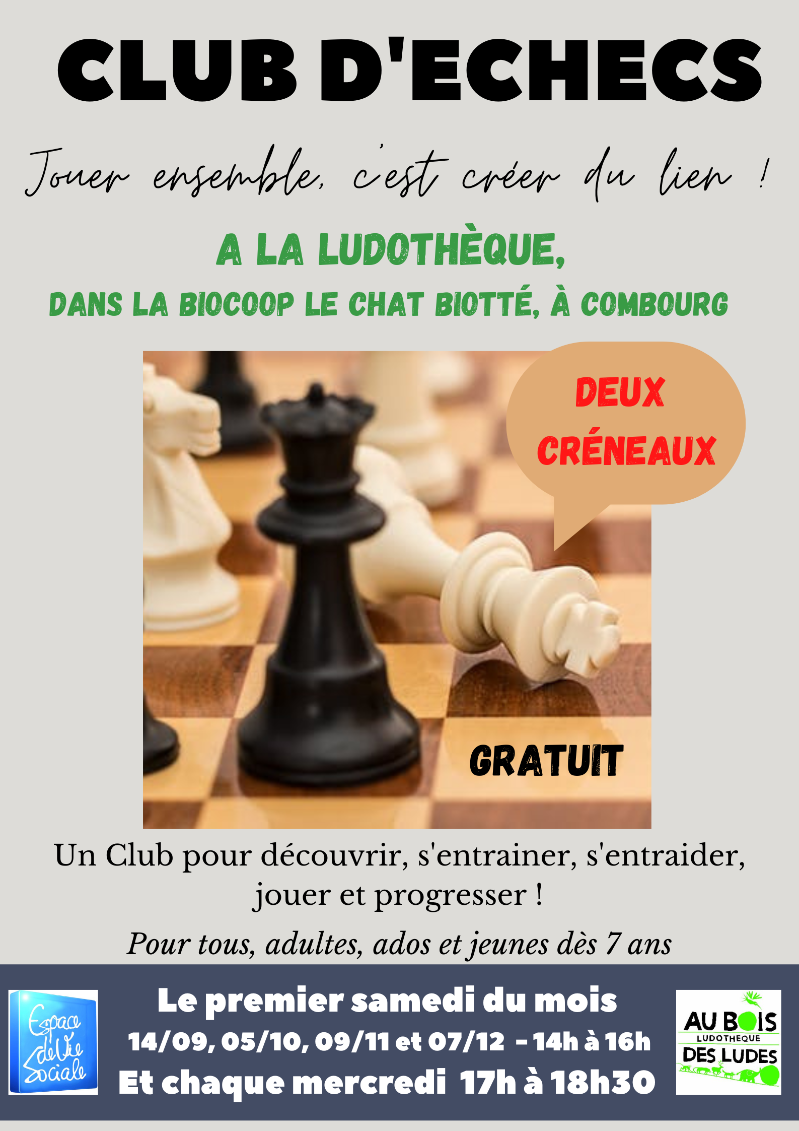 Le club d'échecs se réunit chaque 1er samedi du mois à la ludothèque de Combourg, à l'initiative des bénévoles de l'association. Participation gratuite, pour les adhérents de l'association uniquement. Tout public à partir de 6 ans, débutants et confirmés bienvenus. Les enfants sont sous la responsabilité de l'adulte qui les accompagne.