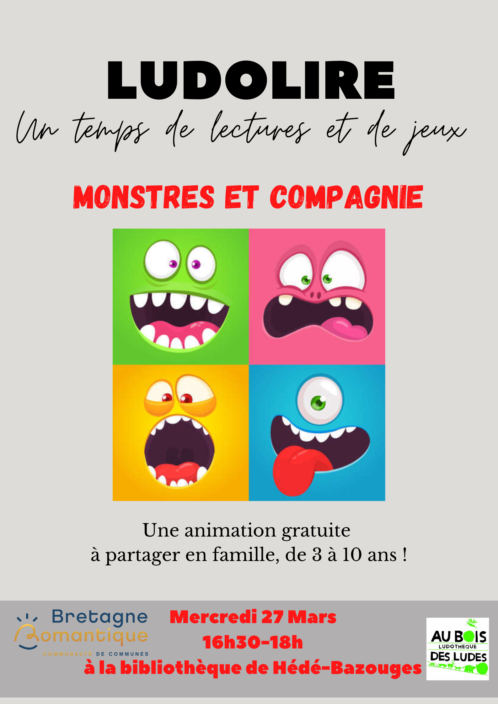 1h30 de lecture et de jeu sur le thème des monstres. Gratuit et tout public, dès 3-4 ans. Les enfants sont sous la responsabilité des adultes qui les accompagnent. Merci de votre compréhension.
