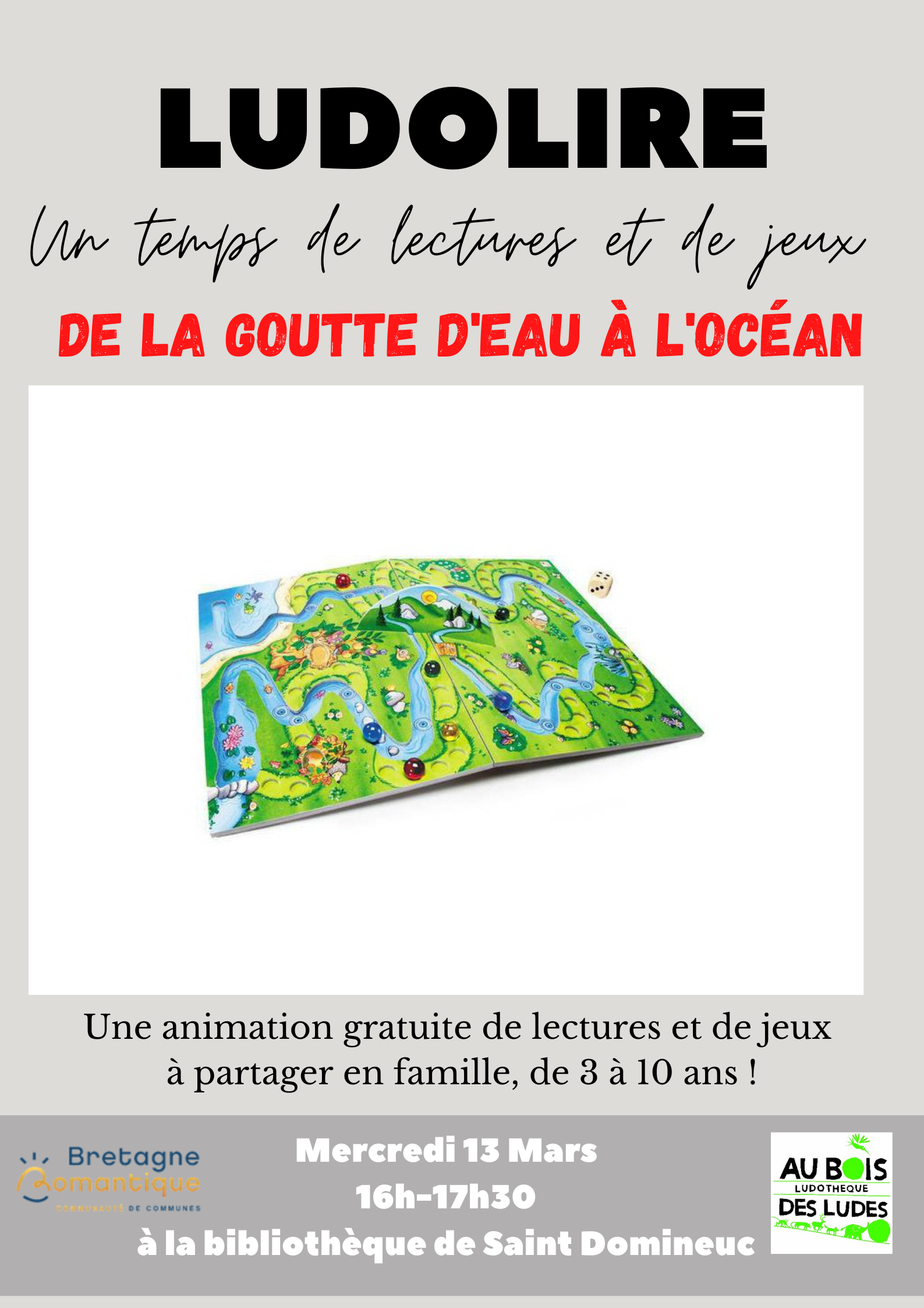 1h30 de lecture et de jeu sur le thème de l'eau. Gratuit et ouvert à tous et toutes, dès 3 ans. Les enfants sont sous la responsabilité de l'adulte qui les accompagne, merci de votre compréhension.