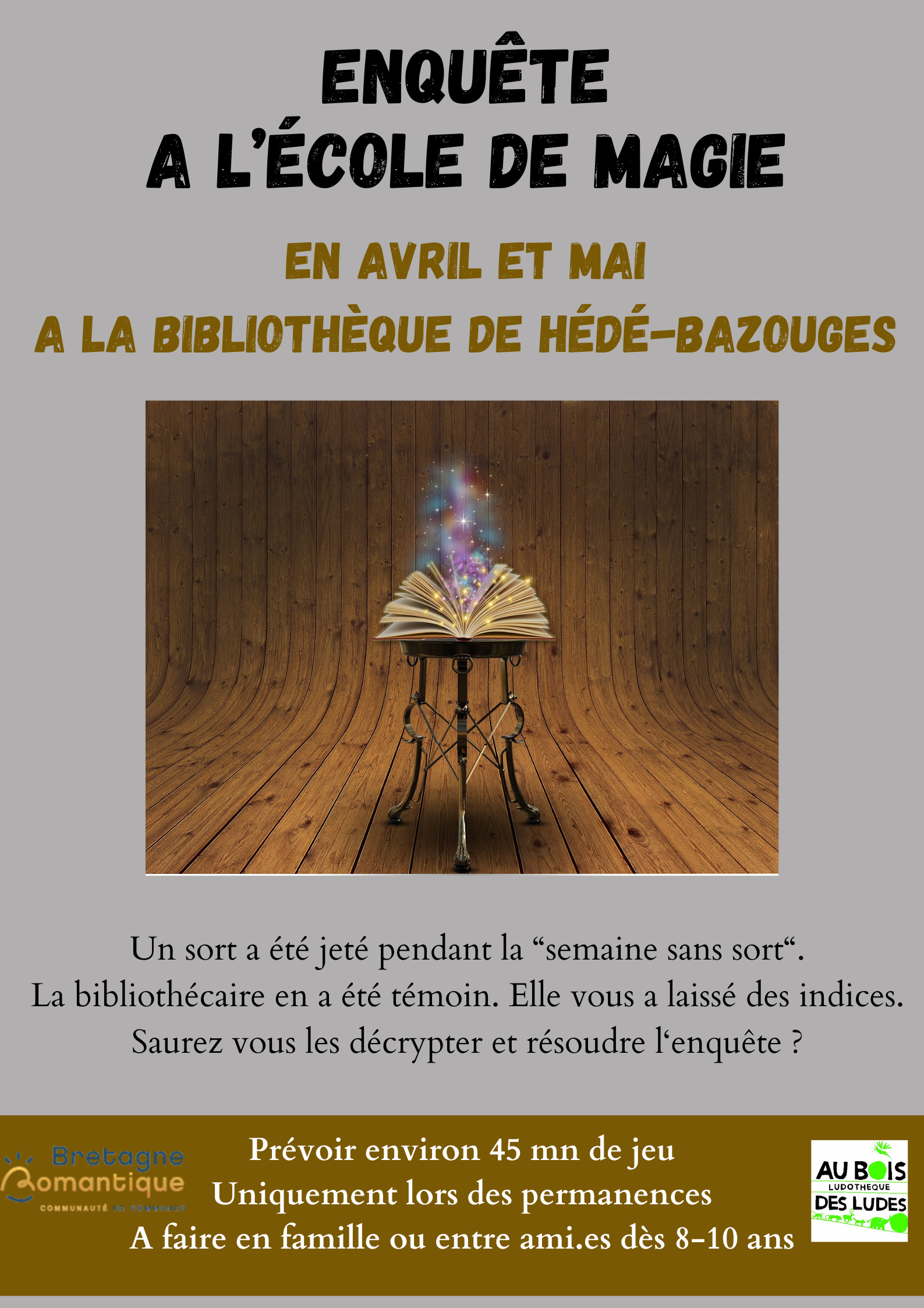 En avril et mai, venez mener l'enquête à l'école de magie. Un jeu accessible dès 8-10 ans, gratuit et en libre accès aux horaires d'ouverture de la bibliothèque d'Hédé-Bazouges : Hede-Bazouges - Réseau des bibliothèques (bretagneromantique.fr)